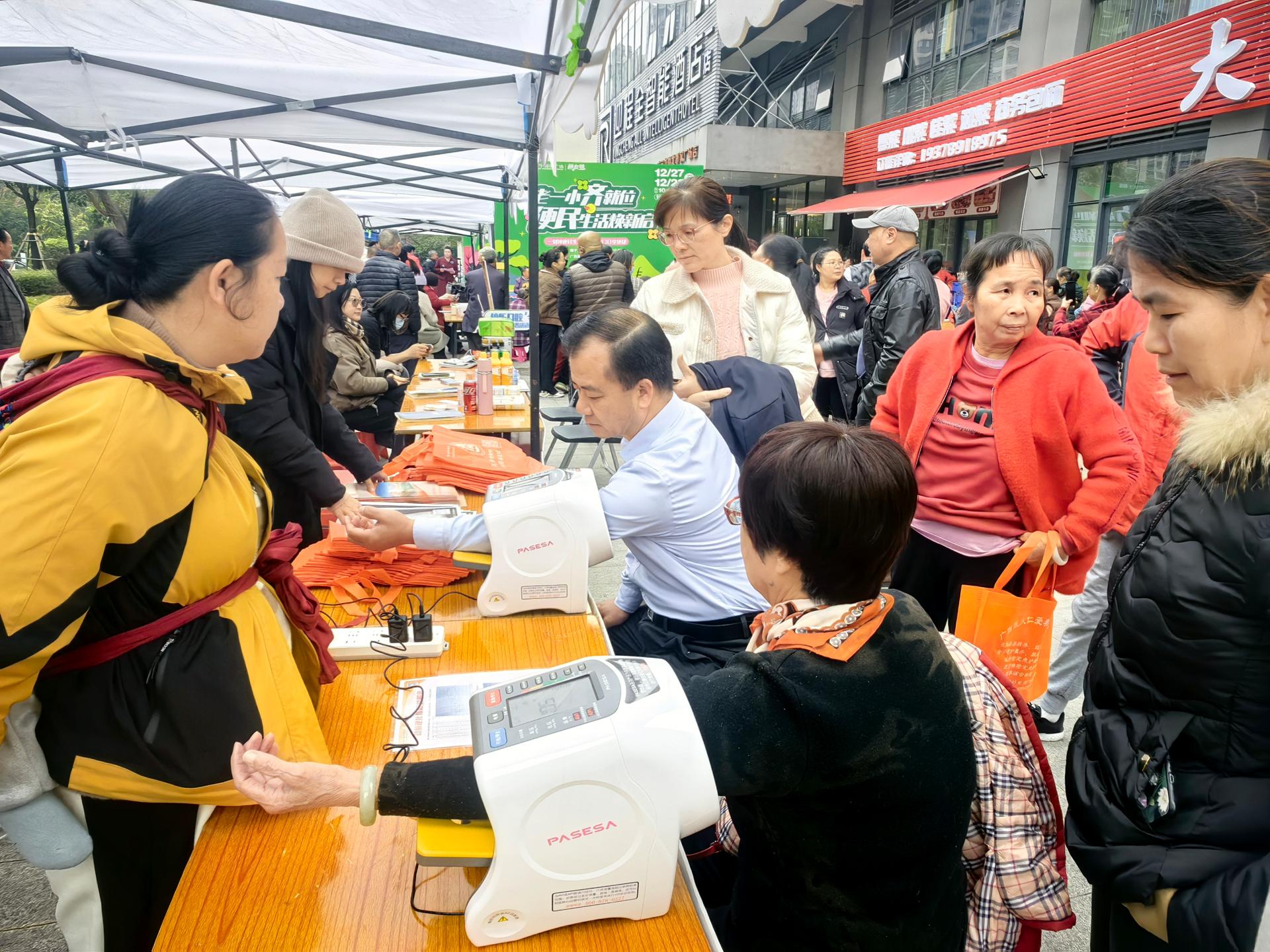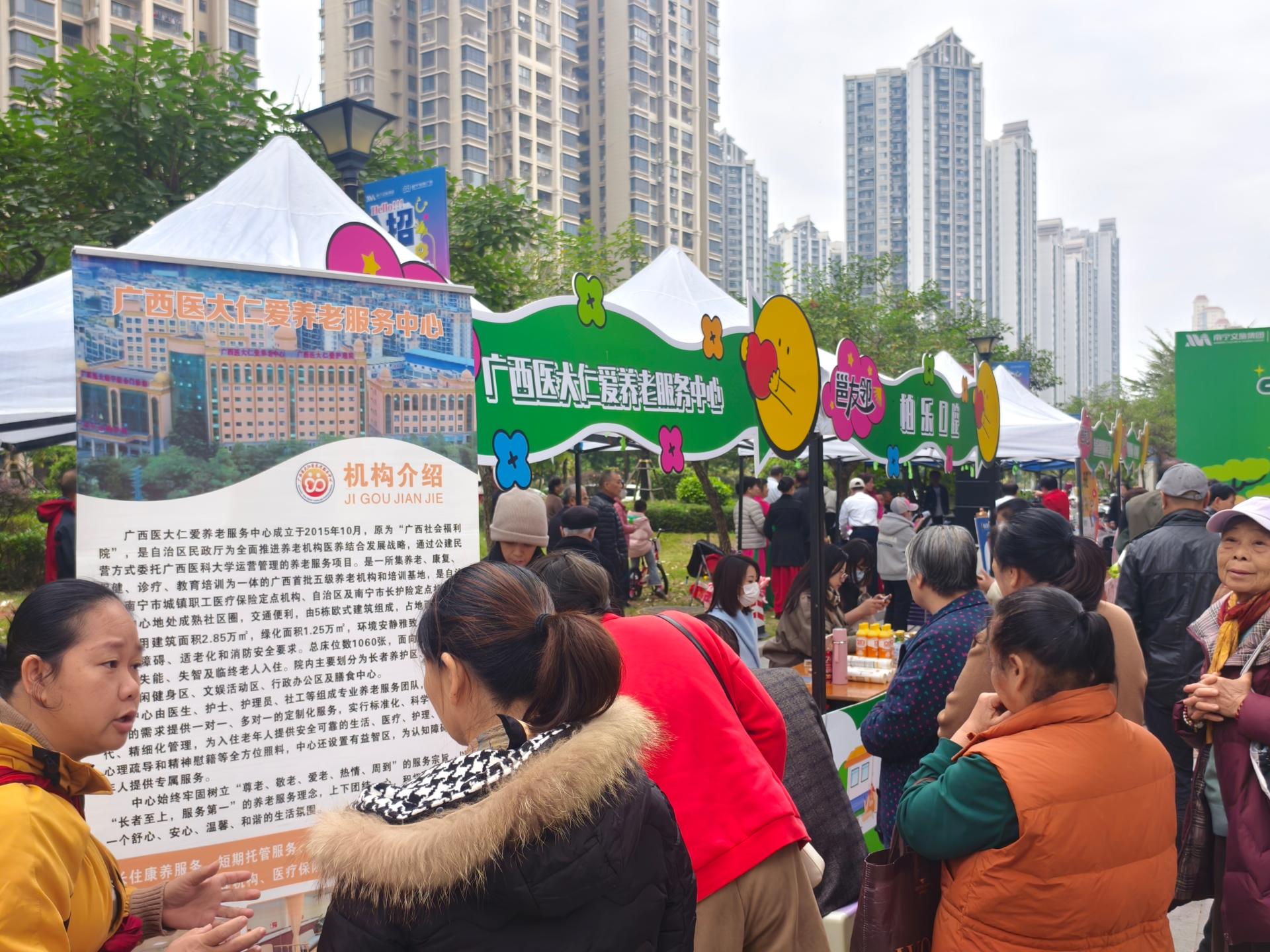 为期两天的市集现场,始终客流涌动、热度不减。康之桥社区食堂的免费低糖米粉、豆腐派送活动每日都引发排队热潮,开摊半小时内便能送出七八十碗热乎美食,让居民直呼“暖心又暖胃”。柏乐口腔的趣味套圈游戏成为全家互动热门,大人小孩踊跃参与,中奖欢呼声此起彼伏;银河大酒店的南宁老友粉、广西国控集团的垦小鲜生鲜现煮试吃,居民赞不绝口;广西医大仁爱养老服务中心的免费动脉硬化检测、广西欣和律师事务所的法律咨询等实用服务,精准对接居民需求,收获老年群体广泛好评。